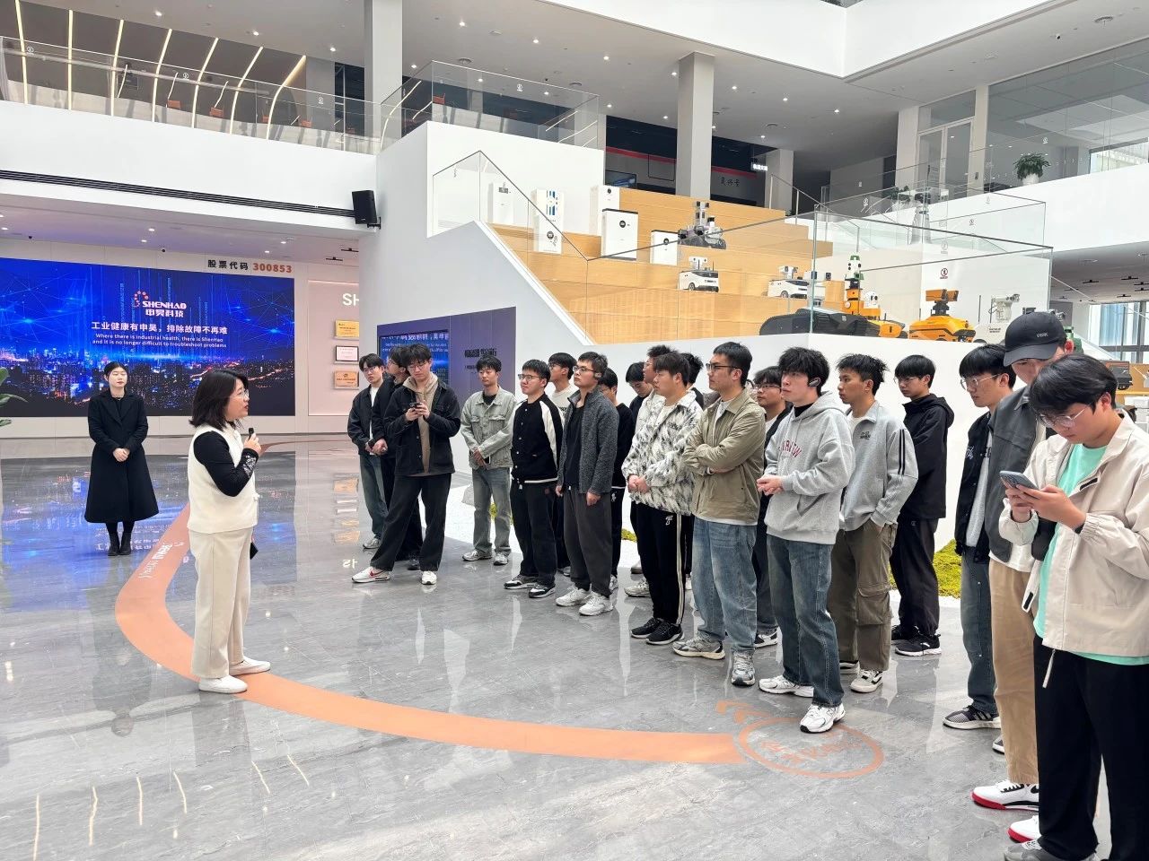 一行人在申昊科技HR负责人李孝凤的陪同下,先后参观了企业智能电网设备展厅、机器人研发中心及数字化生产车间,深入了解公司在智能巡检机器人、电力物联网等领域的技术创新成果。在讲解员的带领下,同学们深入了解申昊科技如何利用传感器、机器人、人工智能等先进技术服务于工业大健康,保障设备的安全运行,也让大家对未来的职业发展有了更清晰的方向。