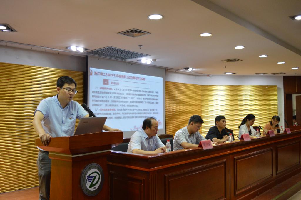 会上,学院党委组织员方水明从指导思想、学习内容、方式与要求、参考资料四个方面介绍了学校关于2018年度教职工政治理论学习的有关安排。随后,学院党委书记潘海鹏以《学深悟透习近平教育思想努力写好高等教育“奋进之笔”》为主题上党课。此次党课也是学院“学习新思想千万师生同上一堂课”活动。潘书记分享了他赴京参加国家教育行政学院第十四期高校中层干部专题研修班的学习心得与感悟,向各位同志讲解了习近平总书记的新时代教育思想,并要求教师党员以身作则,在自己的岗位上落实好立德树人这一根本任务。最后,苏丽辉总结会议精神,大会圆满结束。