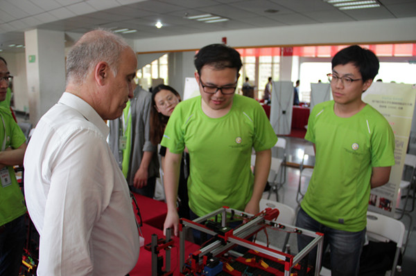 的9支参赛代表队获得了5个一等奖、3个二等奖、1个三等奖的历史佳绩。一等奖作品分别为复合式三轴移动停车装置(由杨金林、赵德明指导,成员为周佳颖、窦岩杰、孙晓航、张荣滔、徐继垦)、智能立体小型停车装置(由杨金林、张国凤指导,成员为陈锦鸣、张鹏勇、张钿、王郁、周哲佳)、智能无干扰立体车库(由马善红、杨金林指导,成员为苏冉、沈晓强、齐希阳、李翔毅、陈培杰)、双行式半自动手推式菠萝采摘收集机(由杨金林、杜小强指导,成员为张谦、余润尧、李禹、郑梁梁、黄皓杰)、辅助人工菠萝采摘机(由马善红、俞亚新指导,成员为龚骏飞、肖扬、张国建、王帅、叶方成)。除此之外,我校还获得了特别贡献奖。同时,在大赛闭幕式的最后环节中,全国大学生机械创新设计大赛组委会秘书长王晶教授、德国慧鱼集团国际事务总监劳伦斯先生、18禁