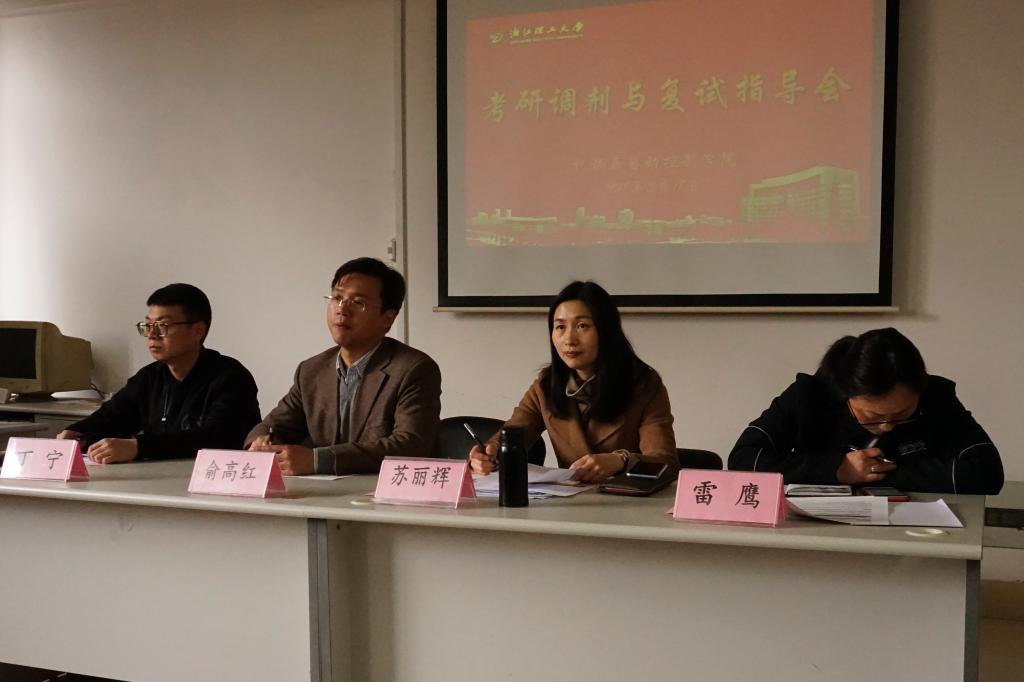 318日下午,机控学15号楼345教室召开了2019届考研复试与调剂指导会。出席本次会议的有学院党委副书记苏丽辉,学院研究生管理副院长俞高红,学院教科办主任雷鹰。会议由学工办主任丁宁主持。
