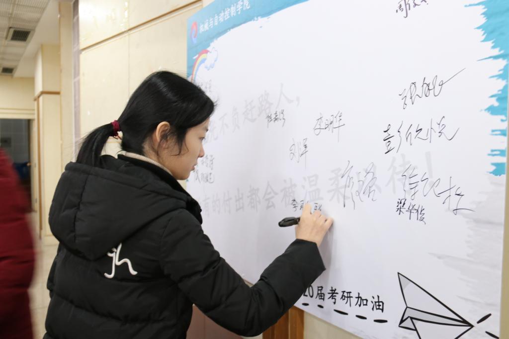12月4日上午,机控学院在活动中心5楼多功能厅成功举办2020届毕业生考研慰问激励大会。学院副院长俞高红教授,学院党委副书记王吴芳以及16级辅导员房维维、王淯霄出席。会议由王淯霄主持。现场近300考研学子到场,他们纷纷在考研墙上签名。