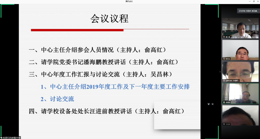 会议第一阶段,由学院党委书记潘海鹏教授讲话,向各位专家介绍了示范中心的基本情况。随后,由俞高红就2019年度中心基本概况、人才培养、科学研究、教学研究、仪器设备研制和改装、中心队伍建设、信息化建设、中心示范与交流以及在师资队伍培养、国际交流与合作、标志性高水平研究成果等中心主要存在的问题向各位专家进行了汇报,并提出了中心下一年度的发展思路。教指委几名专家分别就示范中心2019年度的报告对中心的建设提出宝贵的意见和建议,最后,委员会主任吴昌林教授肯定了示范中心2019年的各项工作,并指出了目前存在的一些问题。