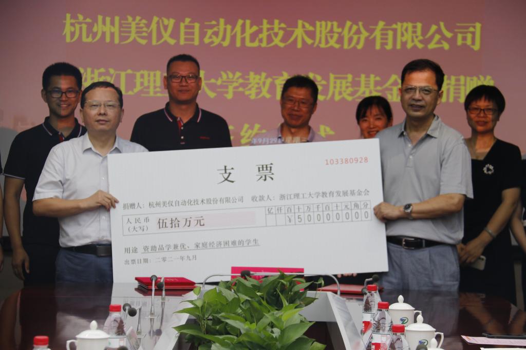 会上,杭州美仪自动化技术股份有限公司向学校捐赠人民币伍拾万元整,设立“美仪奖学金”。陈建勇与丁程签订捐赠协议,并为丁程颁发捐赠证书。