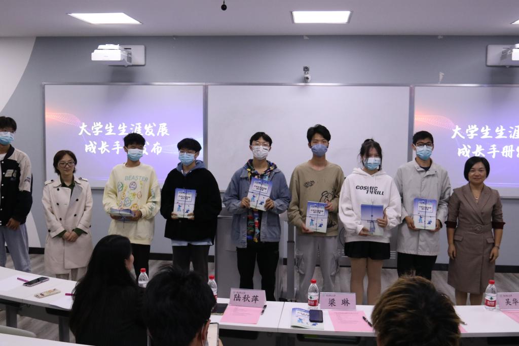 举办了大学生生涯发展引领计划启动仪式暨大学生生涯发展成长手册发布会。招生与就业指导处处长梁琳、学院党委副书记陆秋萍、生涯教育指导老师唐艺林、2022级本科生辅导员吴华雄及50名大一学生代表参会,会议由学院学工办主任朱敏主持。