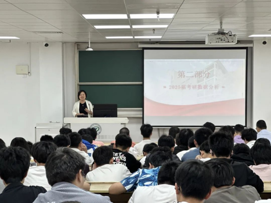 党委副书记陆秋萍做2025届毕业生考研数据分析。基于学院2025届本科生考研情况,她为同学们提供全面客观的参考依据和考研指导。她表示考研是对大学学业的检验,也是一场成长历练,希望同学们准确定位,精准复习,明确目标,坚持到底。