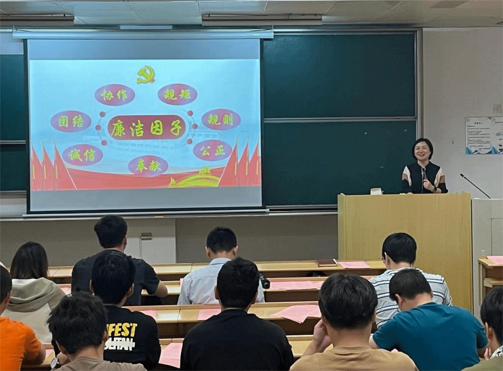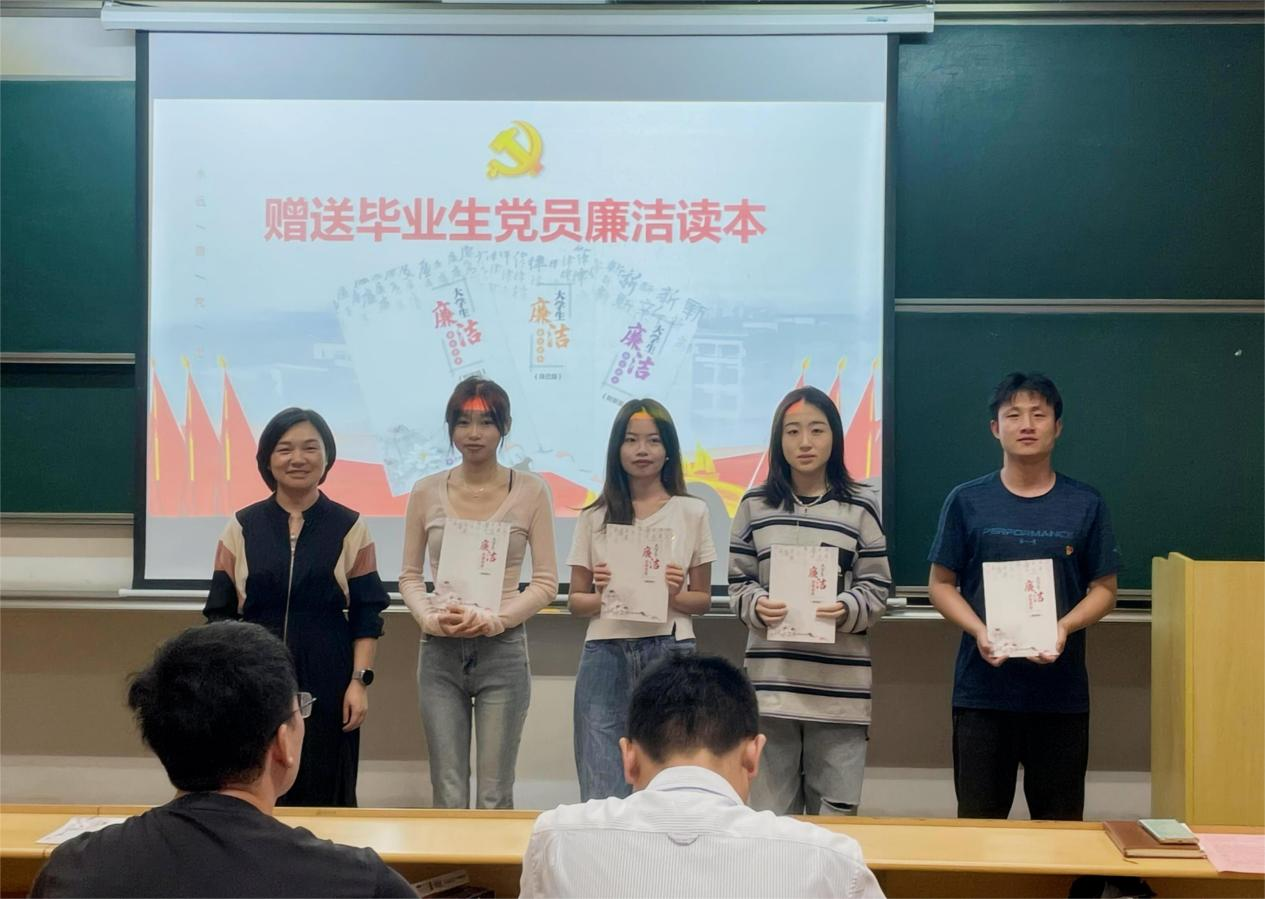 紧接着,陆秋萍为毕业生党员带来一堂廉洁专题党课。围绕浙理廉洁因子,结合《中国共产党章程》、《中国共产党纪律处分条例》、《中国共产党廉洁自律准则》等读本要求,运用丰富的廉洁楷模故事和警示案例,强调每一名党员必须“扣好人生第一粒扣子”,在遵守党纪上做到严要求,在廉洁自律上追求高标准,始终做到忠诚、干净、担当。党课最后,陆秋萍代表学院向毕业生党员赠送了学院自主整理编撰的廉洁读本,勉励毕业生党员步入工作岗位,必须秉持廉洁从业的原则,发挥工匠精神,精益求精,为实现党的使命和人民的期待贡献自己的力量。